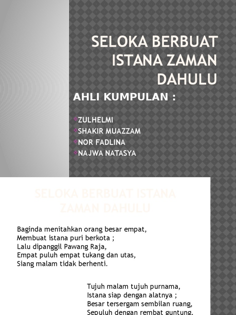 Muat turun halaman 1-12 di FlipHTML5. PDPPBM0620M Harsyakila Binti Noordin menerbitkan Seloka Berbuat Istana Zaman Dahulu pada 2021-05-18. BERBUAT ISTANA ZAMAN DAHULU Created by IZZATI DAN INTAN MAKSUD RANGKAP RANGKAP 1 Raja memerintah empat orang pembesar membina istana yang dikelilingi parit dan tembok.