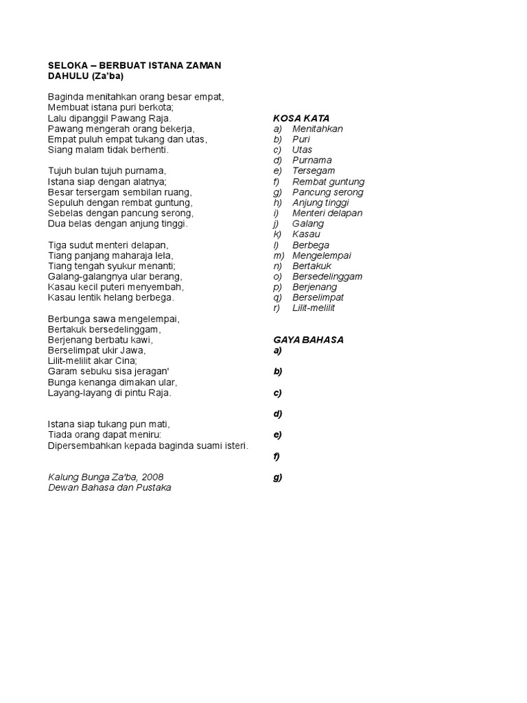 Tingkatan 5 Puisi Tradisional Seloka Berbuat Istana Zaman Dahulu Za Ba Executive Education Centre
